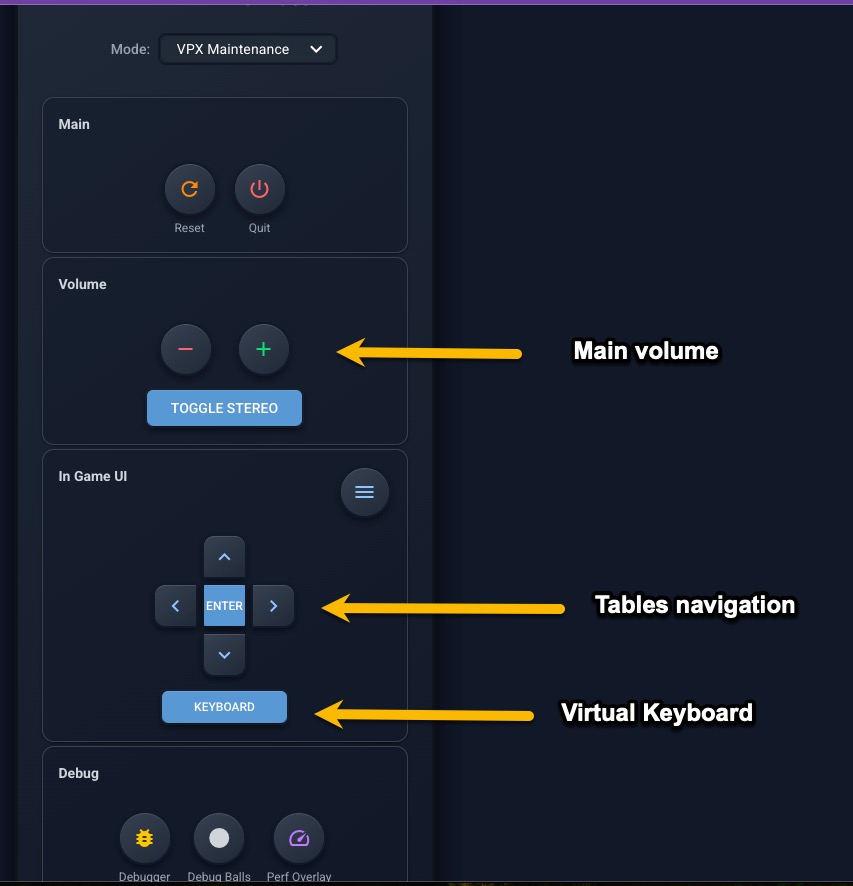 - VPX Maintenance: volume and navigation controls